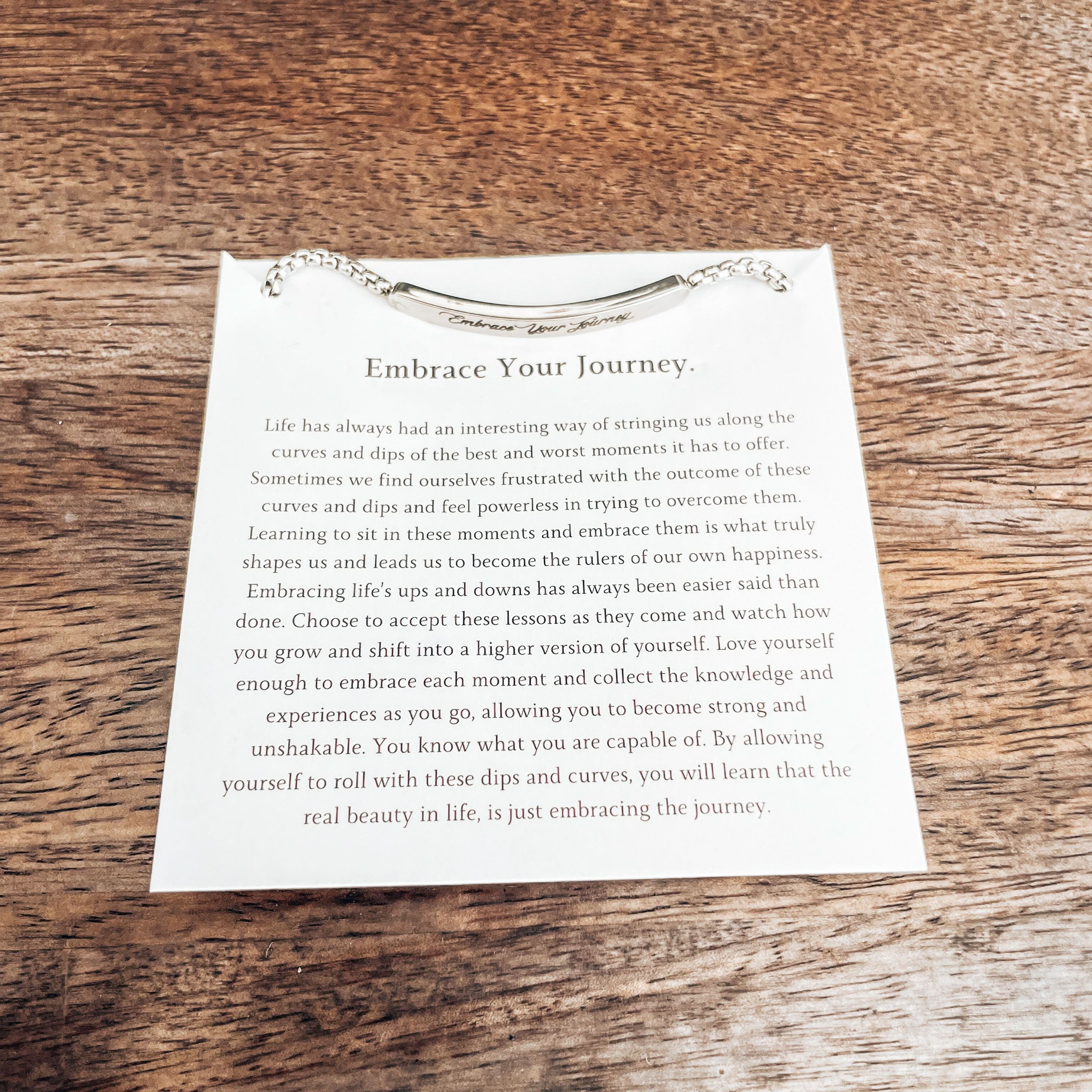 "Embrace Your Journey" Bar Bracelet – A Reminder of Life's Adventure: Wear this sleek and meaningful bar bracelet as a daily reminder to embrace your unique journey through life. Let these words inspire you to cherish every moment, welcome new experiences, and appreciate the path you're on.