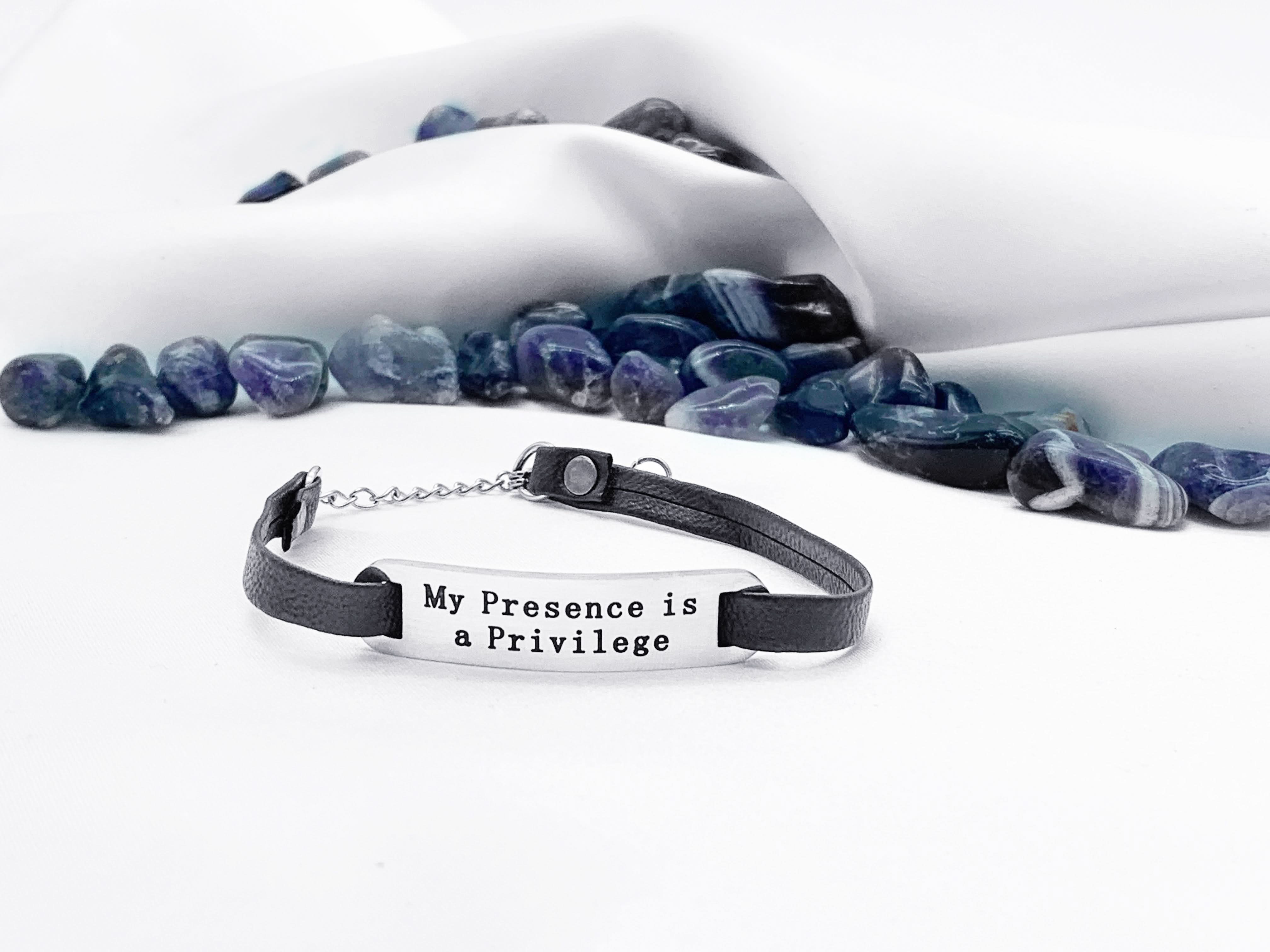 Meet our "Presence is a Privilege" Leather Bracelet – it's all about celebrating you.You are such a special soul, your presence truly is a privilege.This isn't just any bracelet; it's a reminder, a confidence booster, and a style statement rolled into one.