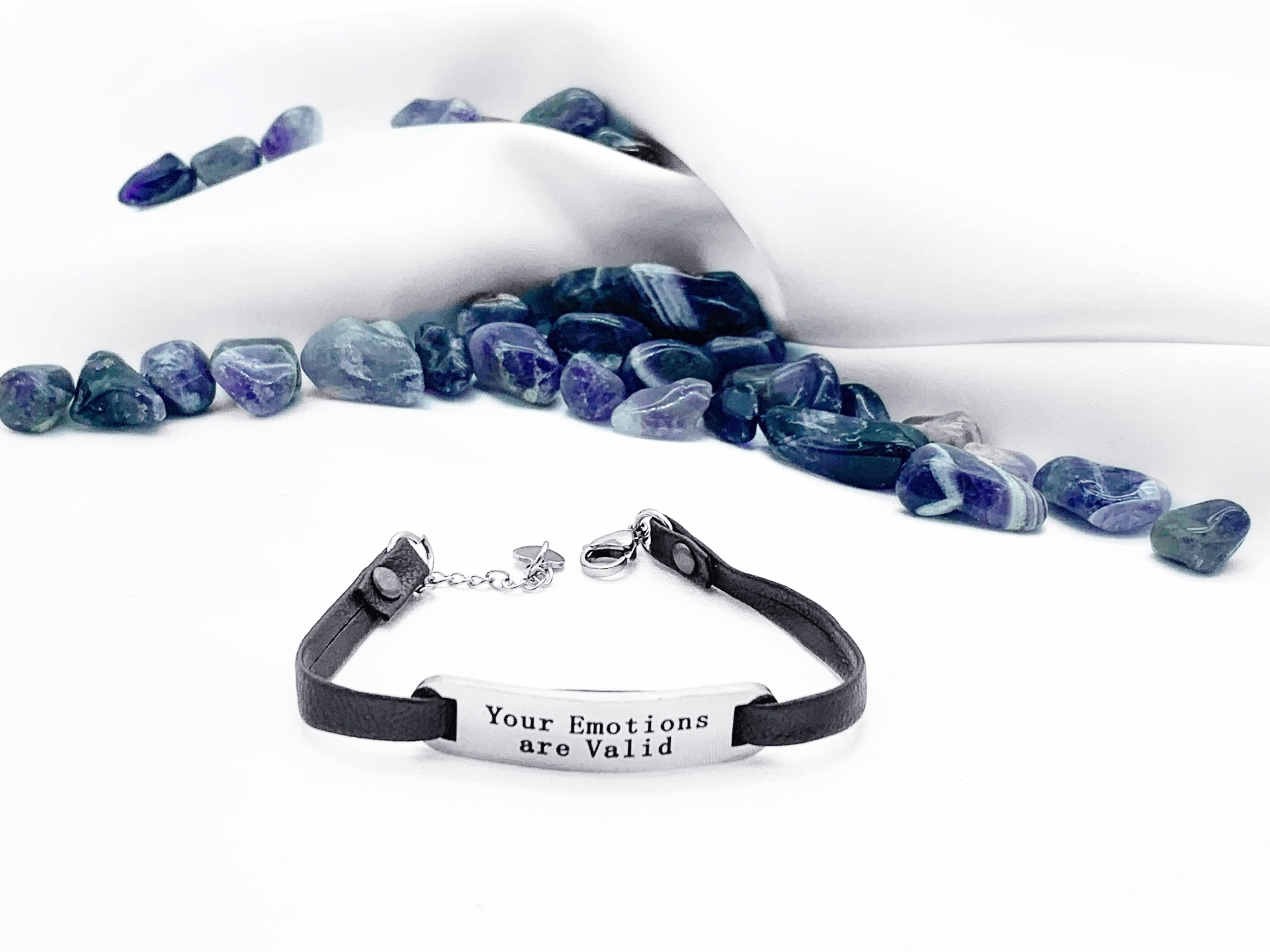 "Your Emotions Are Valid" Leather Bracelet – Empowering Self-Expression: This leather bracelet bears a powerful message: "Your Emotions Are Valid." It's not just a stylish accessory, but a reminder to embrace and express your feelings, no matter what they may be.